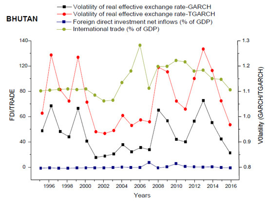 Furthermore, our other analysis of comparing the effects of exchange rate volatility on international trade and FDI for the individual countries highlights that the exchange rate volatility measured with GARCH significantly positively affected international trade for the countries such as Bhutan, Maldives, and Nepal. On the contrary, it showed the significant negative impact on international trade for Pakistan. While, the exchange rate volatility measured with TGARCH showed the significant positive impact on international trade for the countries such as Bhutan, Maldives, and Nepal.