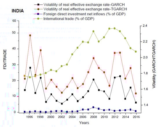 Exchange Rate Volatility vs. FDI/Trade (India).