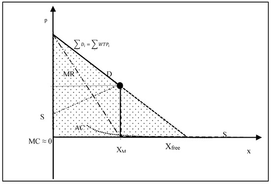 The profit-maximizing quantity is determined, where the marginal revenue equals the marginal cost, as indicated by the optimal point, XM. However, this is also the break-even point for digital platforms. Thus, for free digital goods, the consumer surplus is represented by the scattered triangular area. Note, over the time, that the demand curve for digital goods is of an S-shape. This shape characterizes a slow demand in the beginning, and after hitting the break-even, the demand is free of scale, due to the network effect and economies of scale.