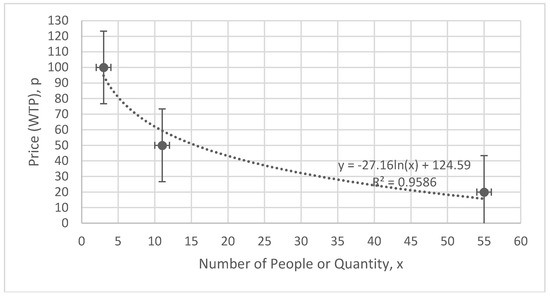 Figure 2 represents the demand curve or willingness-to-pay for Facebook. The experimental data reveals that 55 respondents had a WTP of 20 € per week, 11 respondents had a WTP of 50 € per week, and three respondents had a WTP of 100 € per week. In total, we had 69 data points, with the exclusion of two outliers. The logarithmic fit of the data was of good quality, with an R-squared of 0.95. From this approximation, we found the prohibitive price of approximately 125 € and computed the minimum number of people for a free good (network effect) per week, as follows: