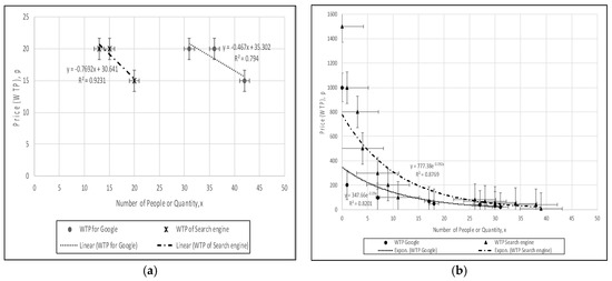 Our experiment reveals the expected finding. Analyzing the WTP for the fixed price categories of 15 €, 80 €, and 1000 € reveals a downward sloping shape of the demand curve (Figure 3a). This is a robust finding. The same downward sloping curve occurs for the free price categories (or willingness-to-accept), where the participants can freely enter a price in order to stop using Google or other search engines (Figure 3b).