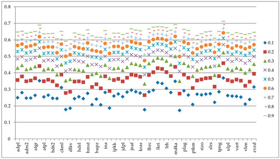 Firstly, based upon the signs in Table A1 (in Appendix A), each factor was normalized by using Formulas (2) and (3). The distinguishing coefficient was chosen ranging from 0.1 to 0.9 and the results of the degrees of grey incidence for each stock. Since the ranking does not change with respect to the distinguishing coefficient (see Figure 1), Table 2 is showing Grey relational grades for the value of the coefficient being 0.5. This could be interpreted as the correlation between the performances of each stock with respect to all factors to the optimal value of 1 for each factor. Moreover, here we have chosen equal weights for all of the factors in the analysis as a starting point. This means that it is assumed that investors are regarding all of the information (factors) on stocks in an equal manner. It can be seen that the best stocks in terms of performance in Table 2 are TUHO, MDKA, ATLN, LKRI and LPLH, due to them having the greatest values of degree of incidence. The worst performance had LEDO, OPTE, DDJH, DLKV and INGR. This conclusion is robust when changing the distinguishing coefficient, as it can be seen on Figure 1. Thus, from an initial larger sample of stocks available, investor can use this information to narrow his set of interesting stocks to evaluate further or to invest in the best performing stocks.