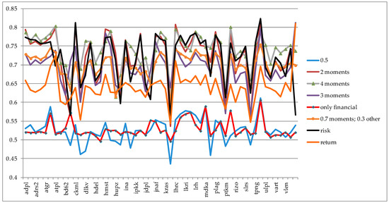In order to obtain more information on the usefulness of using the GRA approach, an additional ranking was made based upon several other criteria. In the first scenario it is assumed that an investor regards only the first two moments of return distribution equally and gives them equal weight. Moreover, the investor ignores all other factors. This scenario is denoted “2 moments”. Other scenarios include: investor equally weights only the first three moments (“3 moments”); first four moments (“4 moments”); only the financial ratios data (“only financial”); major weight is given to the risk (50%, whilst other 50% is equally distributed to all other factors; “risk”); major weight is given to the return (50%, whilst other 50% is equally distributed to all other factors; “return”) and final scenario in which 70% of the weight is given to return distribution moments, whilst other 30% to other factors (named “0.7 moments; 0.3 other”). Thus, the whole procedure of calculation was performed again and the Grey incidence indices are compared on Figure 2. Although it seems that for many cases the ranking remained the same, some major differences arise when investors change their preferences. The detailed ranking is shown in the Appendix A, in Table A3. Some major differences occur for, e.g., stock ZVZD, which was ranked the best according to the scenarios “3 moments” and “return”, but is almost the worst (53 rank out of 55) when taking into account scenario “risk”. Thus, the ranking will depend upon investor’s preferences and subjective goals.