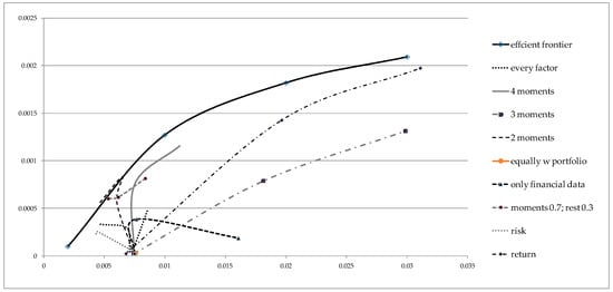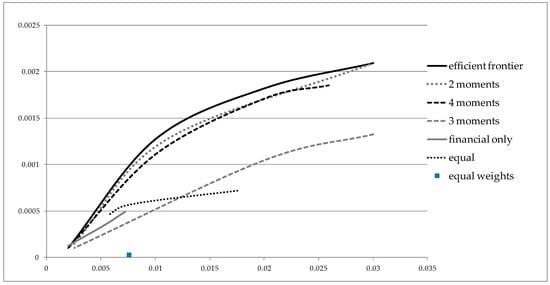 Finally, we wanted to construct efficient frontiers for the best performing scenarios from Figure 3 in the Markowitz spirit. Thus, additional models were optimized in which stock weights were obtained for the best performing 3, 5 and 10 stocks by the ranking in Table A2. Now, all of the frontiers are efficient in terms of Markowitz portfolio optimization, where we change the risk of the portfolio ranging from the minimum variance portfolio until the maximum return. The efficient frontiers are shown on Figure 4. It can be seen that “2 moments” and “4 moments” efficient frontiers are very close to the original frontier; meaning that ranking stocks based upon return distribution moments gives insights for investing into more efficient portfolios, especially compared to the equally weighted portfolio (denoted with “equal weights”), at least in sample.