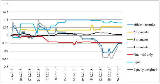 Now we focus on the out of sample results by performing backtesting of the portfolios constituting the efficient frontiers on Figure 4 in order to evaluate the performance based upon ranking from the GRA approach. The performance measures are calculated based upon the Knight and Satchell (2002) performance measurement book. It is assumed that an investor uses the GRA ranking system results from Table A2 in order to construct portfolios at the beginning of 2018 and holds those portfolios until mid 2018. For every efficient frontier from Figure 4, we extracted 4 portfolios: minimum variance, maximum return and two in between to represent different risk aversions in the analysis. Thus, in total we observe 24 different portfolios and the equally weighted one as well. The characteristics of those portfolios are given in Table 3. It can be seen that regarding the realized return, the best portfolio in total was the one where equal weights were given to all of the criteria in the GRA ranking system with the return maximization approach. In general, the “2 moments” portfolios obtained the best results regarding the realized returns, due to having positive returns on for all of the selected portfolios. In terms of risk, the overall best performing were the “Financial only” criteria portfolios. However, investors observe these measures in combination and not separately. That is why firstly we compare Sharpe ratios for every portfolio in order to obtain reward to risk ratios. It can be seen that in general, the “2 moments” portfolios achieve greatest (positive) values of the Sharpe ratio, especially when investors aim to maximize the portfolio returns. The “3 moments” portfolios obtained the worst performance regarding this ratio out of sample. This is somewhat in line with Figure 4 where the “3 moments” frontier was the farthest from the original efficient frontier, while the “2 moments” frontier was the closest.