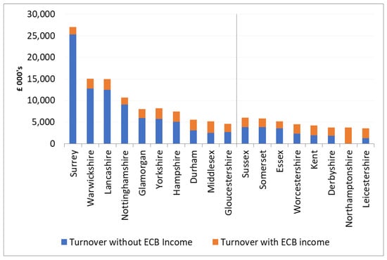 Furthermore, of the counties that have relatively low revenue, a high proportion of this is attributable to the ECB grant income. In some cases, this ECB grant income accounts for over half of a club’s total revenue (Middlesex, Worcestershire, Kent, Derbyshire, and Leicestershire) (see Figure 2).
