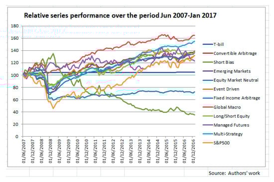 (b) To visualise the performance of the different strategies in the period of the study (June 2007–January 2017), the value of all series on the various strategies, indexed at 100 at the beginning of the series, is plotted below in Figure 1: