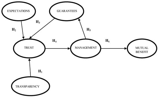 The model is composed of one-dimensional and first-order constructs. All of them can be measured by formative indicators, not only including exogenous constructs such as expectations, guarantees, and transparency, but also to endogenous factors such as trust, management, and mutual benefit. Based on () and as argued in our hypotheses (from H1 to H6), trust comes from other previous constructs in the shape of expectations, transparency, and guarantees, but trust also positively influences management and mutual benefit. To summarize, the model integrates the short-term (e.g., management/guarantees) and long-term (feedback between expectations and mutual benefits) relationships between constructs that enable the overall model to be attained.