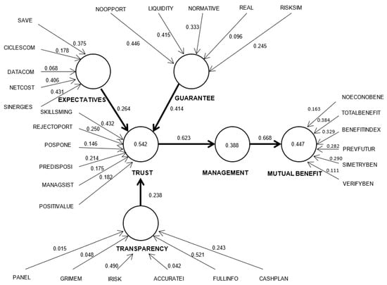 The constructs in the model are measured by formative indicators () which are observed variables that act in a causal, predictive, or preceding fashion in regards the construct. In the case considered here, all the constructs are one-dimensional, i.e., first-order and formative. The same applies to the constructs that occupy exogenous positions (expectations, guarantees, and transparency) and those that occupy endogenous positions (trust, management and mutual benefit). Thus, causality flows from the ex-ante constructs (expectations, transparency, and guarantees) toward trust, and finally from management toward mutual benefit. Notably, the methods traditionally used to determine the reliability and validity of reflective measurement models are not suitable for use with constructs where the direction of causality is precisely the opposite (). For this reason, Diamantopoulos and () suggested specific procedures for measuring and assessing formative constructs. Instead, content validity should be assessed before empirically evaluating the formative measurement model to ensure that formative indicators capture all or the main facets of the construct. We applied a content specification in which the domain of the content that the indicators try to measure has been clearly specified. We provided a set of indicators that exhaustively cover the domain of each formative construct. To reinforce the justification of the operationalization of the construct as formative, we reviewed the literature and ensured a reasonable theoretical foundation, as was developed in Section 2. In short, the validity must be tested based on theoretical reasoning and the opinion of experts (). In practice, formative models are not easy to defend because the researcher must be completely sure that all the possible causes of the latent variable have been considered by the indicators (). For that reason, it is absolutely essential that research includes formative measures and the PLS technique must be used to establish an acceptable level of validity of measurement before continuing with the structural analysis of relationships. Below, the measurement model is first assessed through a multicollinearity analysis in the formative measurement model, and second, by the assessment of the significance and relevance of the formative indicators. The structural model was then used to test for the hypothesized relationships.