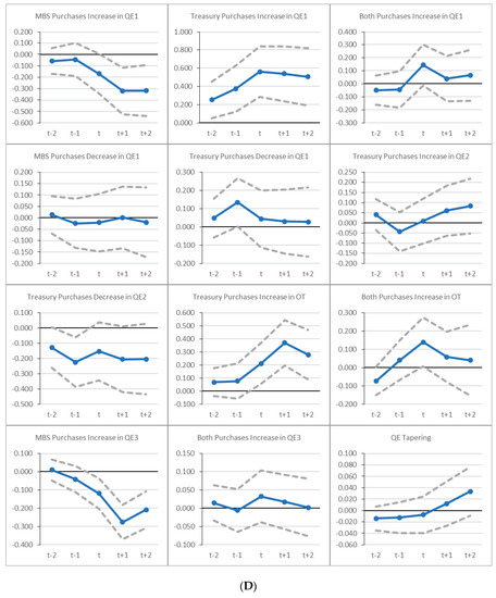From Figure 2, Panel D, the mortgage-Treasury rate spread went down largely after increases in MBS purchases and went up after increases in Treasury purchases. The graphs show significant and negative CARs at −0.31 and −0.29 percent one day after the event day for events of MBS purchases in QE1 and QE3, while significant and positive CARs at 0.55, 0.06 and 0.38 percent one day after the event day for events of Treasury purchases in QE1, QE2 and OT. The results are in line with the previous conclusion from regression analysis that announcements of an increase in MBS purchases lessened the credit risk of holding mortgages over Treasury securities, while announcements of an increase in Treasury security purchases augmented the risk.