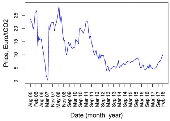 For numerical illustration we employ the dataset on historical CO prices (emission allowances, EUA) from the European Emission Trading Scheme (ETS) () spanning the time period August 2005–February 2018 (further referred to as the “historical period”). These prices are presented in Figure 1.