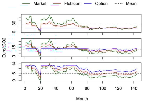 For the purposes of numerical calculations we arbitrarily set the flobsion’s discount d to and the strike price to 8 Euro/tCO (both for the option and the flobsion). The total amount that was paid in three possible cases: just paying actual market price for emissions, using a flobsion or an option is presented in Figure 3 for three price scenarios: original historical prices, those doubled, and halved, where the initial purchase prices for both option and flobsion are “fair” for the original (historical) price distribution. The total amount paid per unit of emissions when flobsion is involved for all possible market prices stays between those of an option and the market price as illustrated in Figure 3.