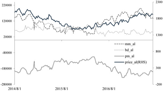 The main objective of this paper is to identify whether participation by some types of traders explains the extent to which the market moves as a consequence of investment money flows. This paper uses weekly COTR4 data from August 2014 to July 2017, which includes the trading positions of various types of investors, such as a money manager (mm), broker-dealer/index trader (bd), producer/merchant/user (pm), and other reportable parameters. Money managers are engaged in managing LME contracts on behalf of clients, while broker–dealer/index traders are engaged in transactions and use the LME to manage or hedge the risk associated with those transactions (see details in the LME disaggregated reports). These data are used to compute net futures positions and evaluate percent changes against the previous week. For example, the variable mm_al is the weekly percent change in net position changes in the aluminum markettrackingcopper (cu), aluminum (al), lead (pb), zinc (zn), tin (sn), and nickel (ni). The benchmark futures price for base metals is that of a contract expiring after three months (3M), as obtained from Reuters over the same the period and computed using Thursday–Thursday5 log returns to 3M futures prices. For example, the variable r_al denotes the weekly log returns in the aluminum market.