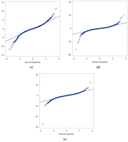 Quantile–quantile plots for the heavy metal price returns. (a) Gold price returns. (b) Silver price returns. (c) Copper price returns (d) Zinc price returns. (e) Platinum price returns.