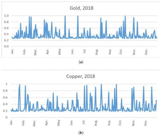 The results from the empirical analysis can be used to assess the tendency for jumps to occur in the five metals markets. The probability that at least one jump occurred is then 1 minus the probability of observing no jumps. Recall, the probability that no jumps occur at any time t can be obtained from Equation (9). The predicted probabilities, that at least one jump occurred in each day of the sample, was calculated. The resultant predicted probabilities during 2018, for gold and copper, which are representative of the remaining series, are plotted in Figure 2. the jagged nature of the figures indicates the high frequency of jumps that occur within a year. Finally, the pairwise correlation among the jump probabilities was examined, with the result that very little correlation was observed between the implied jump probabilities. The highest correlation was observed between the probability of at least one jump in the gold market and the silver market (0.345). The remaining correlations varied between 0.04 and 0.245. Given the literature on co-movement among commodities (); () the correlation observed is considered rather low. However, the pairwise correlations levels are higher within metallurgical categories (e.g., precious metals) than across categories.