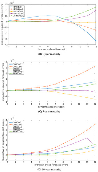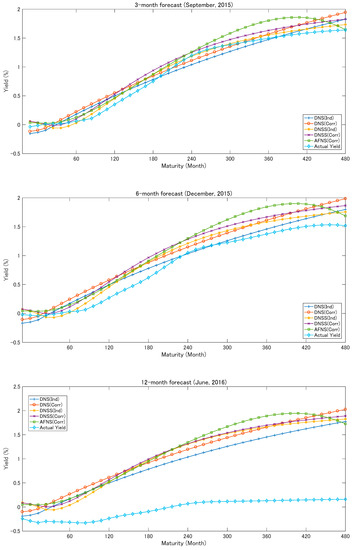 Until now, we have shown theoretical models of DNS, DNSS, and AFNS (continuous- and discrete-time versions). In the next section, we show empirical models of Equations (8), (9), and (45). Moreover, we compare the forecast performances of the yields.