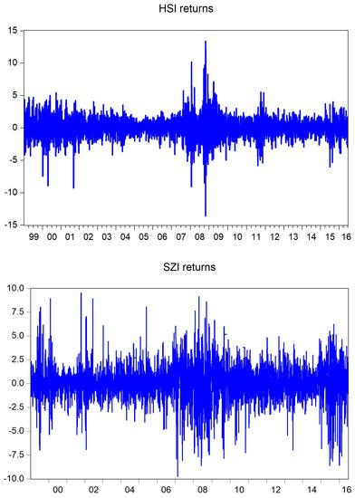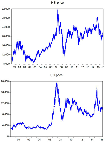 This study uses two daily stock indices for the period from January 1999 to June 2016: The Hang Seng Index (HSI) of Hong Kong Exchange and the SZSE Component Index (SZI) of Shenzhen Exchange.4 A-shares on the Shenzhen Exchange were initially launched for domestic investors and B-shares for foreign investors. However, since 9 July 2003, A-shares are available to foreign investors on a limited basis. To examine the openness of the A-share market to foreign investors, the data were divided into two sub-samples using 9 July 2003, as a cut-off date.