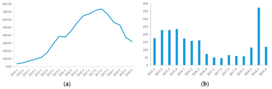 Table 1 describes the development of China’s online lending industry, and Figure 1a shows the growth of China’s online lending transaction volume. China’s online lending industry is undergoing a period of adjustment after experiencing a sharp rise. Figure 1b summarizes the number of downtime and problem platforms in the online lending industry from 2015 to 2018. This figure shows that China’s online lending industry remains immature, and risk pressure is still relatively large. This information indicates the difficulties that China’s online lending platform is currently experiencing. However, it also shows that China’s current regulation on online lending is becoming increasingly mature, and online lending is gradually embarking on a path toward healthy development.