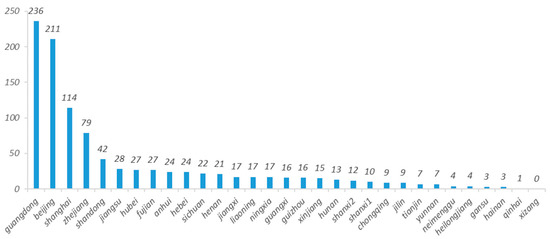 Similarly to the ups and downs of China’s online lending industry, the development of online lending in China’s provinces also differs. Figure 2 summarizes the distribution of network lending platforms that are operating normally in each province in 2018. By the end of 2018, the top four regions with the highest numbers of online lending platforms that were operating normally were Guangdong (236), Beijing (211), Shanghai (114), and Zhejiang (79). The number of platforms in the four provinces accounts for 61.84% of the total number of online lending platforms in China.