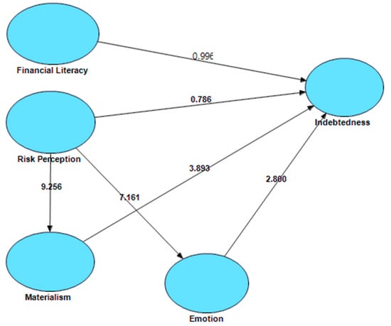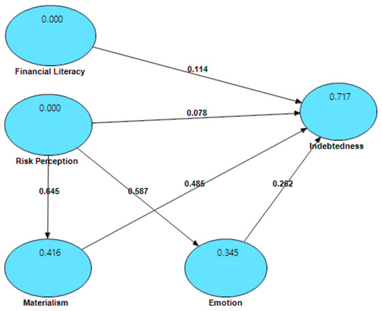 The findings of the structural model analysis are illustrated in Table 4. In the structural model, the results are examined through beta coefficient (β), and t-statistics for latent constructs. The findings show that four hypotheses are accepted at significant levels of 0.01 and 0.05, respectively, while two hypotheses are not accepted. According to Hair et al. (2013), the value of t-statistics equal to or higher than 1.64 are considered significant. The beta coefficient value assesses the strength of the relationship between independent and dependent variables. The beta coefficient value ranges from zero to one, indicating positive or negative significant relationships. The findings illustrate that a higher significant relationship is found between risk perception–materialism (β = 0.645) followed by risk perception–emotion (β = 0.587), materialism–indebtedness (β = 0.485), and emotion–indebtedness (β = 0.262). Therefore, H3, H4, H5, and H6 are accepted and H1 and H2 are not accepted. Figure 3 shows the structural model with the hypothesis test. The findings also reveal that the coefficient of determination (R2) value represents the percentage of variance. Hence, the dependent variables can be explained by independent variables, and range from zero to one. Cohen (1988) assumed that the closer the value to one, the more the independent variable explains the dependent variables. Thus, risk perception explains 41.6% of materialism and 34.5% of emotion. In addition, a total variance of indebtedness, 71.7%, is explained by financial literacy, risk perception, materialism, and emotion.