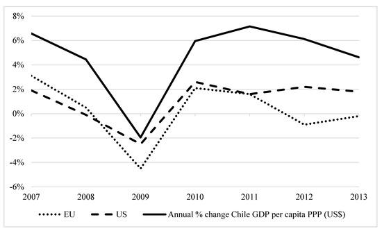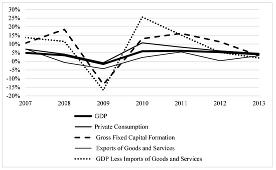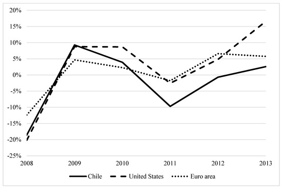 Figure 1 depicts Chilean, US, and EU annual GDP growth, and highlights the cross-country variation of GDP during the GFC. Figure 2 displays the change in selected components of Chilean GDP. It is noteworthy that the growth rate of Chilean total private consumption and GDP were impacted less by the GFC’s relative to the substantial and negative growth in fixed capital formation and total domestic spending (i.e., GDP less imports). Hence, the impact of the GFC on Chile’s economy were varied, yet substantial, on certain components of the GDP.