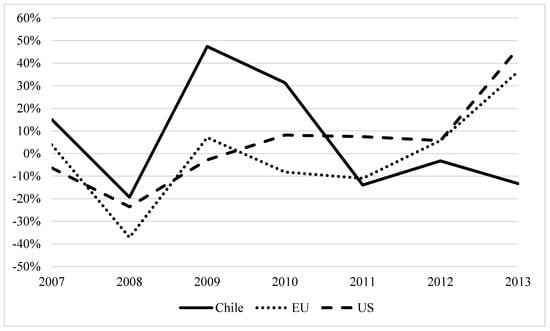 Change in households’ net worth as a percentage of Gross Domestic Investment for Chile, EU, and US.