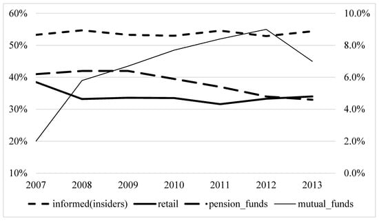 Retail investors make up a second shareholder group, controlling the outstanding shares not held by insiders and institutional investors. Inspection of Figure 5 reveals a noticeable decline in the equity holdings of retail investors during 2008 and a simultaneous increase in the equity holdings of insiders and the two groups of institutional investors. The decline in the equity holdings of retail investors in 2008 suggests that selling by retail investors may be responsible for the Chilean contagion results cited in the Dungey and Gajurel (2015) and Bekaert et al. (2014) studies.