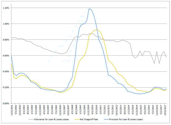This phenomenon is illustrated in Figure 1 where we plot Net Charge-off Rates (NCORs), the Provision for Loan and Lease Losses (PLLL), and the ALLL for the period 4Q01 to 4Q17. These data represent all insured depository institutions in the US as made available by the Federal Deposit Insurance Company in the forms FR Y-9C, which are commonly termed the “Call Reports”. We show here an outstanding loan balance weighted average across all banks, or a depiction of an “average bank”. The figure shows that, as NCORs and PLLs both rise at the beginning of the downturn period starting in 2007, the ALLL lags this increase and persists in rising well into the economic recovery period to peak in 2010. This build-up in the ALLL occurred just as bank asset quality was in decline, with worsening capital ratios, resulting in both declining earnings and lending activity, thereby adding to the severity of the so-called Great Recession.