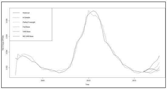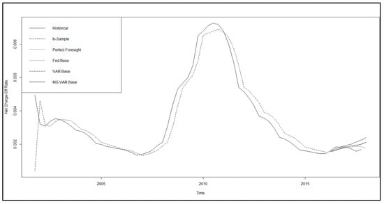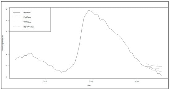Stress testing is concerned principally with the policy advisory functions of macroeconomic forecasting, wherein stressed loss projections are leveraged by risk managers and supervisors as a decision-support tool informing the resiliency institutions during stress periods8. Traditionally, the way that these objectives were achieved ranged from high-dimensional multi-equation models, all the way down to single-equation rules, with the latter being the product of economic theories. Many of these methodologies were found to be inaccurate and unstable during the economic tumult of the 1970s as empirical regularities such as Okun’s Law or the Phillips Curve started to fail. Starting with () and the VAR methodology, we saw the arrival of a new paradigm, where, as opposed to the univariate AR modeling framework (; ; ), the VAR model presents as a flexible multi-equation model still in the linear class, but in which variables can be explained by their own and other variables’ lags, including variables exogenous to the system. We consider the VAR methodology to be appropriate in the application of stress testing, as our modeling interest concerns relationships and forecasts of multiple macroeconomic and bank-specific variables. We also consider the MS-VAR paradigm in this study, which is closely related to this linear time-invariant VAR model. In this framework, we analyze the dynamic propagation of innovations and the effects of regime change in a system. A basis for this approach is the statistics of probabilistic functions of Markov chains (; ). The MS-VAR model also subsumes the mixtures of normal distributions () and hidden Markov chain (; ) frameworks. All of these approaches are further related to Markov chain regression models () and to the statistical analysis of the Markov switching models (). Most closely aligned to our application is the theory of doubly stochastic processes () that incorporates the MS-VAR model as a Gaussian autoregressive process conditioned on an exogenous regime generating process.