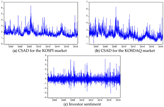 Dynamics of Cross-Sectional Absolute Deviation (CSAD) and Sent series: (a) CSAD for the KOSPI market; (b) CSAD for the KOSDAQ market; (c) Investor sentiment.
