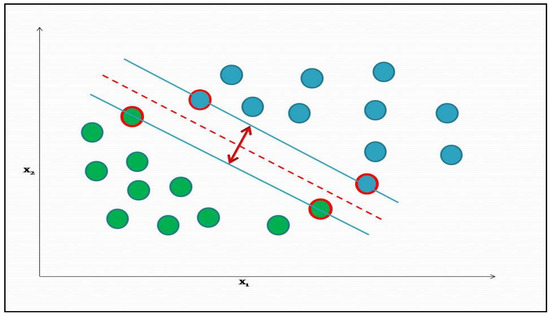 This optimal hyperplane is defined as the decision boundary that classifies each data vector to the correct class and has the maximum distance from each class. This distance is often called a “margin”. In Figure 1, the SVs are represented with a contour circle, the margin lines (defining the distance of the hyperplane from each class) are represented by solid lines and the hyperplane is represented in the center.
