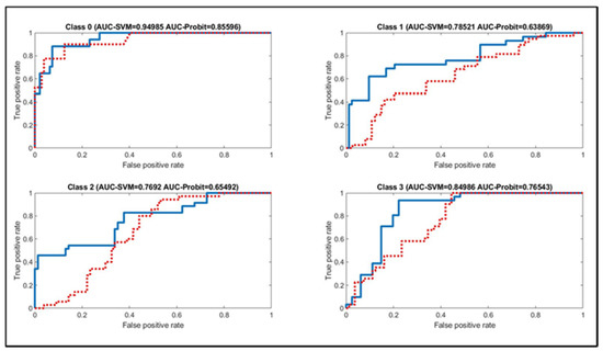 The SVM model achieved higher AUC for all four classes in comparison to the Probit model, reaching 0.95 for class 0, 0.79 for class 1, 0.77 for class 2 and 0.85 for class 3. The respective values of the Probit model are 0.86 for class 0, 0.64 for class 1, 0.66 for class 2 and 0.77 for class 3. Thus, either the accuracy of the AUC reached similar conclusions. Table 10 depicts the results of our bootstrapping training scheme.