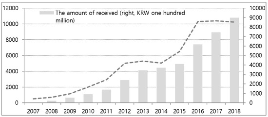 Figure 1 displays the overall trend of the total number of borrowers in Korea, and the amount of reverse mortgage loan periods from 2007 to 2018. The number of mortgages was small before 2011, but has been gradually growing since then. At the end of 2018, the number of mortgages exceeded 60,000. We believe that the number will continually grow going forward.