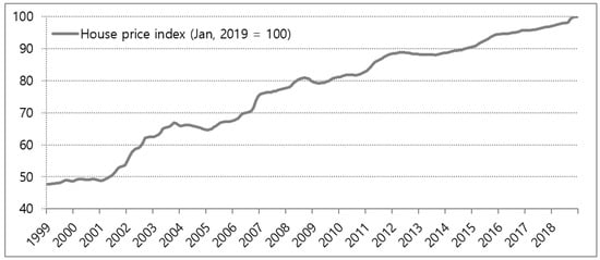 The house price trend in Korea (January 1999 to December 2018). This figure shows the house price index from 1999 to 2018 in Korea. The house price index means 100 points for January 2019.