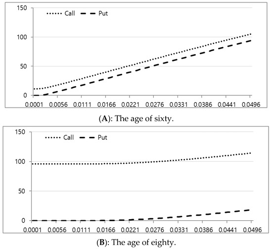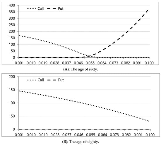 Figure 3 shows the sensitivity of the option value according to the change in CD rate from 0.1% to 10%. In Panel A, the call option value decreases at the age of 60. The intersection point between the call option value line and the put option value line is at 5.5% of the CD rate; the put option value increases from then. On the other hand, at the age of 80, the put option value line shows no change, while the call option value line decreases as the CD rate increases.