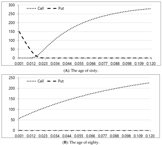 Figure 4 exhibits the sensitivity of the option value according to a change in the risk-free rate from 0.1% to 12%. In Panel A, the put option value decreases at age 60 as the risk-free rate rises. The intersection point between the call option value line and the put option value line is at 1.5% of the risk-free rate, since then only the call option value line increases. On the other hand, at age 80, the put option value line shows virtually no change, while the call option value line increases as the risk-free rate falls.