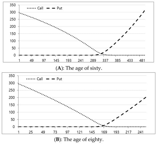 Figure 6 explores the sensitivity of the call option value and the put option value under the assumption of a KRW three hundred house value change from the first month (initiation of the reverse mortgage) to 480 months (100 years). In Panel A, the call option value at age 60 decreases as maturity rises. The value lines of the call option and put option intersect each other at 310 months (26 years), since from this point the put option value increases substantially. In Panel B, the result at age 80 is similar to that at age 60. The call option value decreases as maturity increases. The intersection between the call option value and the put option value happens at 169 months (14 years), after that only the put option value remains.