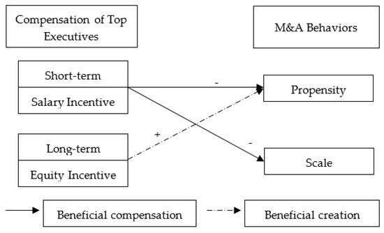 Top executives play an important role in the corporate mergers and acquisitions (M&A) behaviors (Zhou et al. 2020; Amewu and Alagidede 2019; Agyei-Boapeah et al. 2019). Separation of ownership and management rights enables high-ranking executives who control the resources of listed corporations to use M&A as a means for personal gain (Tang et al. 2020; Jensen and Meckling 1976; Fama and Jensen 1983). Consequently, such executives are motivated to pursue investments of large scale rather than large return, leading to losses in shareholder values. As an effort to increase the interest drive among high-ranking executives and shareholders, listed corporations often introduce a set of executive incentives, which aim to reduce agency costs through profit-sharing schemes that improve incentive compatibility (Chu et al. 2020).