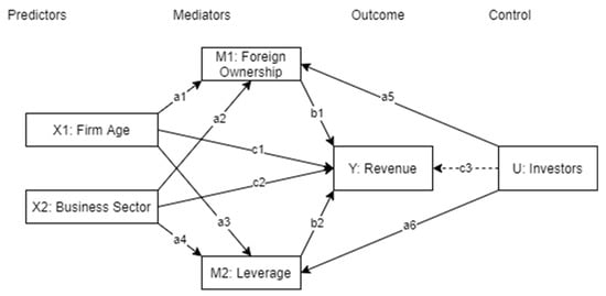 Figure 1 presents the statistical framework apportioning the two predictors’ causal effect into indirect (through foreign ownership, M1 and leverage, M2) and direct (through path c). Preacher and Hayes (2008) state that mediation only occurs when a predictor indirectly influences the outcome variable via at least one intervening factor (mediator). Mediation hypotheses postulate by what means or how an explanatory (X) influences the explained variable (Y) through potential intervening factor(s) or mediators (M). The present study examines the effect of firm age (X1) and the business sector (X2) on firm financial performance (Y). Besides, it explores the intervening role played by foreign ownership and financial leverage in the said relationship. Extensive empirical literature details the impact of access to formal finance and performance (Tsuruta 2015, 2017; Cheong et al. 2020), but how do leverage levels influence the relationship between the predictors and the outcome variable.