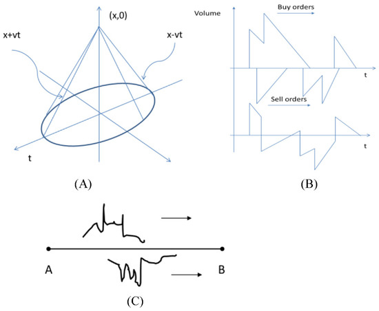 (A) Relativistic light cone. Only part x > 0 is drawn for clarity. (B) Schematic shape of the random signal propagating across the line. The upper axis shows “Buy” and “Sell” orders separately, and the lower axis shows the sum of the orders. The vertical axis may correspond to the number of shares traded, or to the aggregate dollar volume, depending on the organization of the trading venue and the type of order. (C) “Topology” of the trading network. Exchange is located at point A, and the imbalances are absorbed (cleared) at point B. Traders are distributed along the line AB, according to the Poisson law.