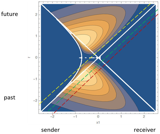 Space/time propagation of the signal in the trading system. The signal propagates from the lower left corner of the frame to the upper right corner parallel to the diagonal. The purple line indicates (the signal is in the future with respect to an observer at the origin), the green line is (signal approaches the origin), and the yellow line is (the signal passes the origin). One might consider a as a crude measure of the reaction time of the trading system. Values for the parameters of the Equations (9), (11), and (12) used for all figures are λ = 1.5a, , and and were chosen for the best visual appearance of plots. Hyperbolic structure in the left quadrant indicates the space/time region where the signal is indistinguishable from the noise.