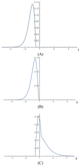 The shape of the pulse in arbitrary units (a response to the delta function) in the cases (A) , (B) , and (C) . The spatial coordinate is measured in the units c·a (see Equation (5)).