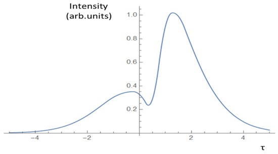 Autocorrelation of the square of the Green function kernel (see Equation (14) in the text), as a function of time delay and v = 0.75c. Limits of integration are arbitrary as a truncation to approximate [−∞, +∞] with the necessary accuracy.