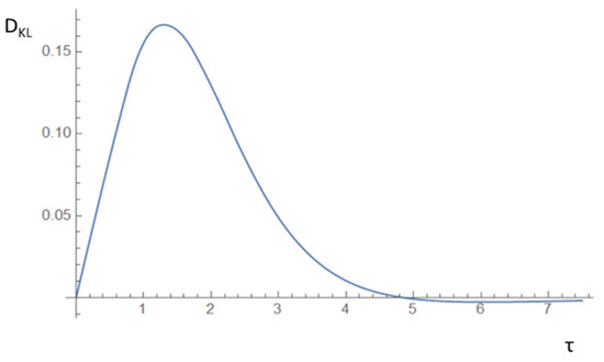 Kullback–Leibler distance (Equation (15)) between Green functions kernels as a function of time delay and v = 0.75c. A small negative tail is spurious and is related to numerical approximations.