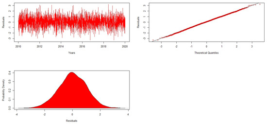 To begin our analysis, we first train with the ratio of 80% training and 20% validation sets. The aim here is to filter the returns so to obtain i.i.d residuals. Figure 2 shows the plot of residuals demand, the Q-Q plot and their probability density (pd). First and foremost, we applied an augmented Dickey Fuller (ADF) test to a time series with the aim to accommodate the Box-Jenkins methodology. The results of the ADF test provided a sufficient evidence that the FTSE/JSE-ALSI contains unit root with both seasonal and non-seasonal differencing of order one. i.e., . The ADF model with intercept plus trend is the one used as its . In this case, a stationary time series is achieved. In model selection, Akaike information criteria (AIC) and Schwartz Bayesian criteria (SBC) congruently advocate that the SARIMA model is of the form which is formulated below as