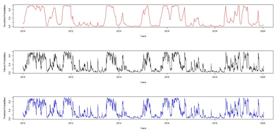 Using the residuals of the estimated we fit MS-EGARCH-GEVD subject to two regimes. The results of fitting the MS(2)-EGARCH(1,1) model to the residuals of the SARIMA model using a training data are presented in Table 2. Setting the number of burns to 10,000 L and the number of MCMC to 510,000 L, we obtained the acceptance rate MCMC sampler of 54.5%. The estimate of a time-invariant mean parameter denoted by is statistically significant. Both the ARCH and GARCH estimates are significant, indicating the presence of conditional heteroscedasticity effects in each regime. According to Sigauke et al. (2014), this implies that volatility shocks are also persistent. In addition, the estimates of a skewed student-t parameter is positive and statistically significant, signifying non-normal distribution as reported in Table 1; while the estimates of a shape parameter are significant implying dependent volatility in each regime. Finally, the gamma estimate is statistically significant, meaning that the effect of negative returns’ shocks on the conditional variance is higher returns.