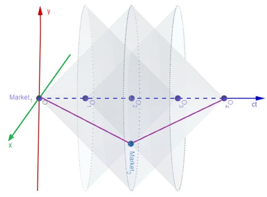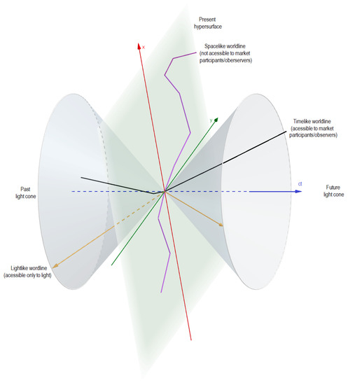 In relativity, representations like that of Figure 1 are widely used; however, with the equivalent time represented vertically. Here, we opted to represent it in the horizontal axis, which is typically the time-related axis in finance. We hope the change of axis will not be considered a physical “heresy” and that it will help those from a financial background to better visualize the concepts. It presents a spacetime diagram where the z axis is omitted. As events can take any direction and dimensions are isotropic, this produces a four-dimension cone called the light cone.5