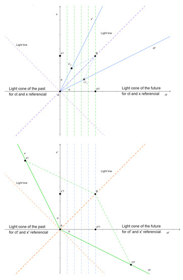 In Figure 2, the reference frames L and are drawn, only with , , x and axes, for the purposes of illustration. Green and light blue dashed lines represent simultaneity lines in the L and reference frames, respectively. The ratio between the reference frame’s relative velocity v and c, can also be defined as the arctan of the .9 The simultaneity line of is constant in the L; however, the simultaneity line of , represented on L, has a slope. Vice versa, i.e., the simultaneity line , in its own reference frame , has no slope. Space contraction and time dilation are implicit from the first two expressions in (1).