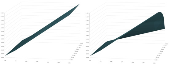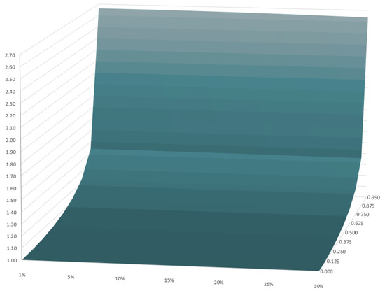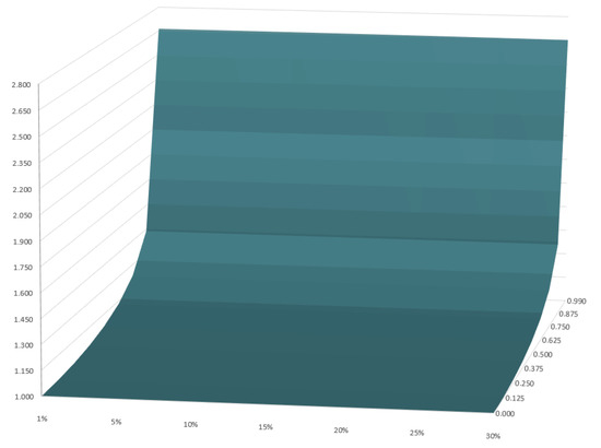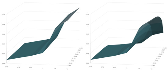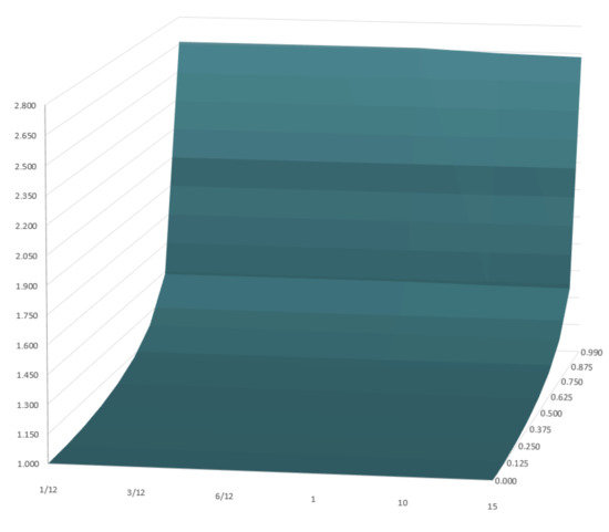 Lemma 7 proves that, for a Call or a Put, the / and / ratios are equal. Consequently, Figure 8 presents both ratios. The data show that the rate of change of the option value, in respect to volatility is lower for than for . This is due to the lower time of the option’s life, measured by the moving , which is not in agreement with the time measured by the stationary . The moving , if travelling at a constant speed, measures less time than the one year of the option time to maturity; therefore, the volatility is reflected in a minor period. Lemma 2 and Proposition 1 prove, respectively, that and . A that is long in a portfolio of one (or a ), from reference frame L and long on a (or a ), from reference frame , measures the portfolio valuation given by . Table 5, presents the values for , and the difference for the volatilities 1.0%, 5.0%, 10.0%, 15.0%, 20.0%, 25.0% and 30.0%, for maturity year and for the velocities 0.0%, 12.5%, 25.0%, 37.5%, 50.0%, 62.5%, 75.0%, 87.5% and 99.0% of c. For simplicity, we consider the values at inception and and both asset prices at inception and strike equal to one .