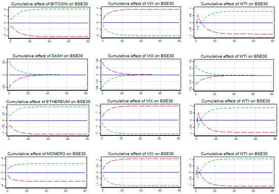 As mentioned above, testing for long- and short-run asymmetric effects of cryptocurrencies, gold, VIX, and oil on the stock market indices is a fundamental step to correctly identify the restrictions to impose on the model to obtain the right specification of the NARDL. The empirical results of the Wald test for long-run and short-run asymmetries are available upon request The Wald test results for the pre-COVID-19 crisis show that Bitcoin has an asymmetric long-run impact on JSE 40 index prices and a symmetric short-run impact on all BRICS stock market indices prices. The Wald tests show that Dash has an asymmetric long-run impact on JSE 40 and a short-run impact on SSE at the 1% level, Monero exerts an asymmetric long-run impact on SSE and RTSI, while Ethereum, Ripple, and gold impact BRICS stock markets in a symmetric manner in the long run. In addition, Monero and Ripple have an asymmetric short-run impact on BSE and BVSP indices. The empirical results of the Wald test result during the COVID-19 crisis indicate that all five cryptocurrencies and gold have only an asymmetric long-run impact on SSE index prices and a symmetric long-run impact on BSE, BVSP, JSE 40, and RTSI at the 5% level. In the short run, the Wald test results indicate cryptocurrencies show a short-run asymmetric impact on BVSP and JSE 40 only. Gold impact BRICS stock market indices in a symmetric way in the short run.
